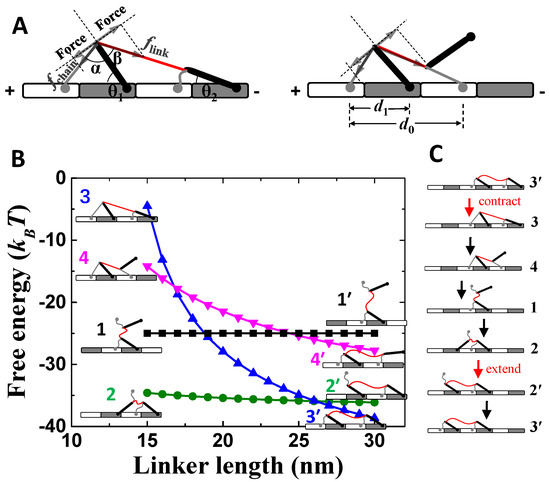 After rear-foot detachment, the one-foot bound state (state 1 in Figure 1B) is not stable yet. The free-energy hierarchy (Figure 1B) suggests that the detached foot bone will bind forward to form the most stable state (state 2 in Figure 1B) under the short linker. In contrast, backward binding forms less-stable states (state 3 or 4) than state 1, which is not likely. If linker extension occurs after state 2 is reached, the detached foot chain will bind to track to form the most stable state (state 3’) under the long linker. Hence, the motor-track system also facilitates a biased binding for the detached foot. If the contraction–extension operations are applied on the linker, the motor can make sustained forward steps along a working cycle of 3′→3→4→1→2→2′→3′ (Figure 1C). Parameters that produce the results are realistic for nanomotor systems (Table 1).