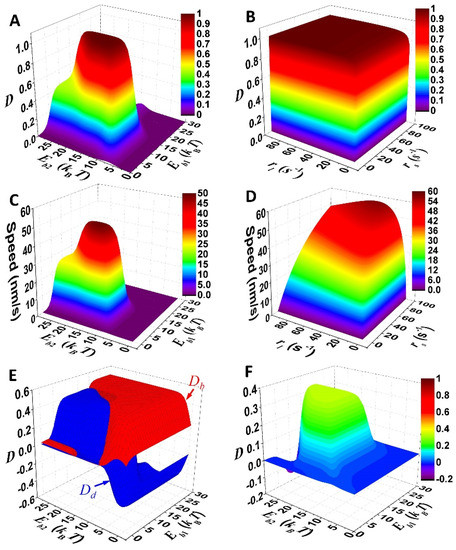 Here the summation of ij only include the six transitions along the designed cycle (Figure 1C), as taking dominance of the cycle for approximation. The derivation of Equation (3) can be found in ref. [31]. Unlike the directional fidelity (Equation (2)), which only relies on entropy productions of rear-foot detachment (ΔS4,1) and forward binding (ΔS1,2), the speed depends on all the six entropy productions of the cycle (Equation (3)) and decays to zero if any one of the six entropy productions approaches zero. Thus, finite speed requires a certain balance among all six entropy productions if the total amount is limited, and a crisis for speed breaks out if all energy is exhausted solely by ΔS4,1 and ΔS1,2 for raising the directional fidelity toward the ultimate limit.