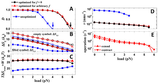 Secondly, after the zero-load optimization, a load-dependent optimization is further conducted to the motor, in which the directional fidelity of the motor under a finite load is further optimized by scanning the two operation rates. The scanning generates two load-dependent operation rates (Figure 5E), which further maximizes the directional fidelity. Such load-dependent driving is possible for biological nanomotors [30] because load can influence the catalysis of the fuel molecule that drives the motor. However, the improvements brought by the load-dependent optimization in directional fidelity (Figure 5A), stall force (Figure 5A), TΔS4,1, TΔS1,2 (Figure 5B,C) and speed (Figure 5D) are marginal. Note that the resultant load dependences of the operation rates (Figure 5E) after the optimization are continuous and smooth, which produces locally maximized directional fidelity. Hence, the zero-load optimization approximately achieves the load-dependent optimization. The effect is understandable if considering that only TΔS4,1 and TΔS1,2 contribute to directional fidelity and work production, and their load dependences remain stable against the adjustment of operation rates for all cases (before optimization, zero-load optimization and load-dependent optimization) (Figure 5B).