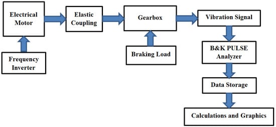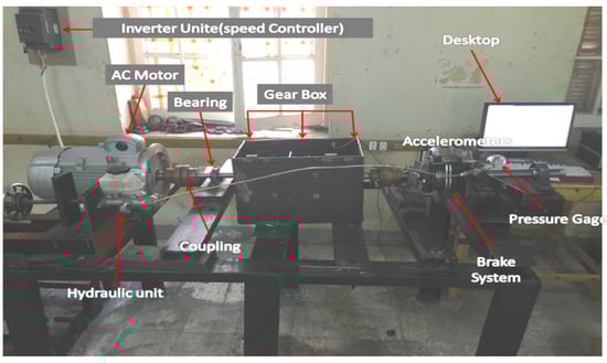 Figure 3 shows a block diagram of the gearbox test rig. The electrical motor speed is controlled by an inverter unit. The output shaft of the motor is coupled with the input shaft of the gearbox. The braking unit uses a hydraulic system to provide the required load to the output shaft through the gearbox. The output shaft of the gearbox is controlled by a hydraulic disc brake unit. The vibration signals are collected using the accelerometer and stored in a PC using Bruel and Kjaer Data acquisition device (analyzer). Finally, features are extracted from the raw time-domain signal, stored, and analyzed.