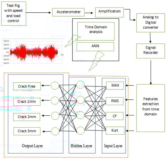 The faults in the gearbox were detected and analyzed in an experimental gearbox setup (see Figure 1). The data were sufficiently accurate and abundant to be evaluated via complex signal-processing techniques. The primary objective of these experimental studies was to monitor the conditions of healthy and cracked gearboxes operating under different applied loads and operating speeds. The experimental facility was developed to obtain the vibration signatures of gearboxes. The driving unit comprised a 7.5-kW AC motor with a maximum speed of 1500 rpm and a three-phase frequency inverter that rotated the driving shaft at different rotational speeds. The disc brake assembly was connected directly to the electrical motor. The braking unit comprised a hydraulic system that applied the required load to the brake system. The pressure value was controlled by a hydraulic valve and displayed on a pressure gauge. The vibration data were provided by a piezoelectric accelerometer with a sensitivity of 100 mV/g, which was directly waxed and placed on the casing near the selected gear to ensure the accuracy of the data. The measured signals were sent to the dual-channel analyzer and saved as vibration signatures. The time-domain signals were acquired under several operating conditions. The stored data in the vibration analyzer were retrieved through a cable connected to the computer for further analysis using PULSE software. A MATLAB code was utilized for training the ANN. More details are provided in the block diagram of the gearbox test rig (see Figure 2).