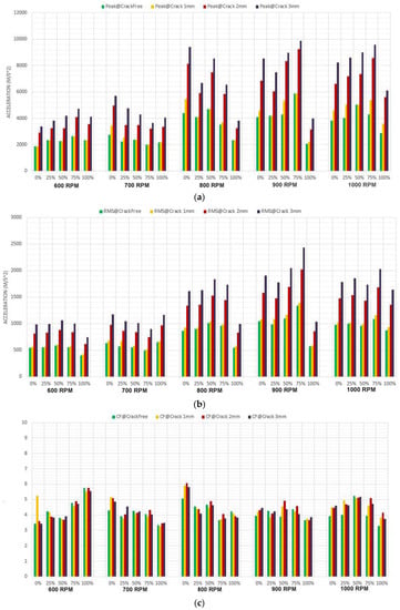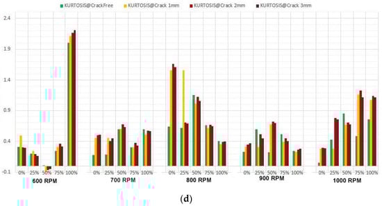 As seen from the crest factors in Figure 6, the maximum amplitude of the vibration signature reflects the intensity of the defect in the system. The maximum amplitude of vibration was an increasing function of the symmetrical crack depth. Identical results were obtained from the kurtosis analysis. From the experimental results at a given operating time, it was observed that the greater the applied running speed, the greater the RMS, and the greater were the maximum and average values of the signals.
