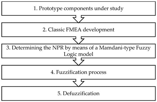 The proposed framework for dealing with fuzzy FMEA is illustrated in Figure 2. The framework comprises three main phases, including (1) prototype components under study; (2) classic FMEA development; (3) determining the NPR through a Mamdani-type Fuzzy Logic model; (4) fuzzification process; and (5) defuzzification.