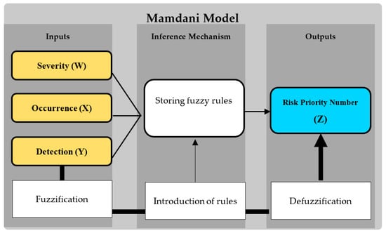 For this case study, the general architecture of the Pure Type Fuzzy System or Mamdani was used []. Mamdani fuzzy models do not require mathematical models of the system to control and are obtained from fuzzy rules or fuzzy conditional statements [], like the one presented in this work. The structure of the fuzzy model poses input and output variables, with the inputs for this model being the evaluation criteria Severity, Occurrence, and Detection and output being the RPN indicator.