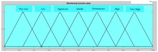 For the RPN output variable, it was considered appropriate to use seven fuzzy sets associated with linguistic terms and denoting a category that allows evaluating the intensity of the variable (Table 7), the scale that is used for the sets, as well as that used in the classic FMEA, is up to 1000, to make a comparison or make symmetry analysis between the results of the Mamdani model and those of the conventional method (Figure 5).