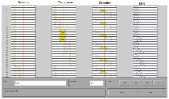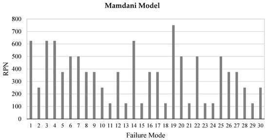 The values that correspond to the sets of the RPN output variable are obtained numerically, according to the case of the rule activated in the Mamdani model when evaluating the different failure modes of the FMEA. The potential failure modes that were identified in the prototype were 30. Each failure mode was assessed using the defuzzification method above, and the values obtained from RPN are as shown below (Table 8).