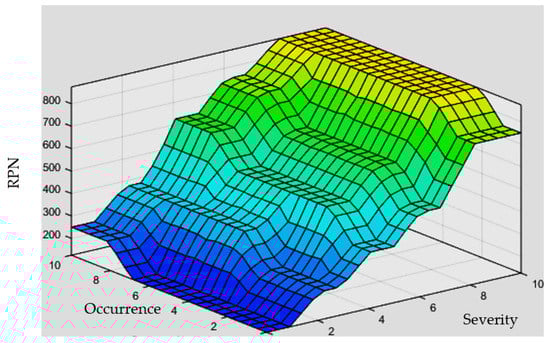 The response surfaces generated from the model are shown in Figure 8 and Figure 9. In them, you can see how the level of risk increases or decreases depending on the input criteria Severity, Occurrence, and Detection, when these tend to take a certain value on the lower axes of the three-dimensional plane.