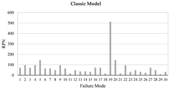 With the defuzzification method “Center of Gravity”, it was possible to obtain the RPN results for each mode of failure of the FMEA, as shown in the following figure (Figure 7). The numbering of the “failure modes” corresponds to that presented in the format of Table 7.