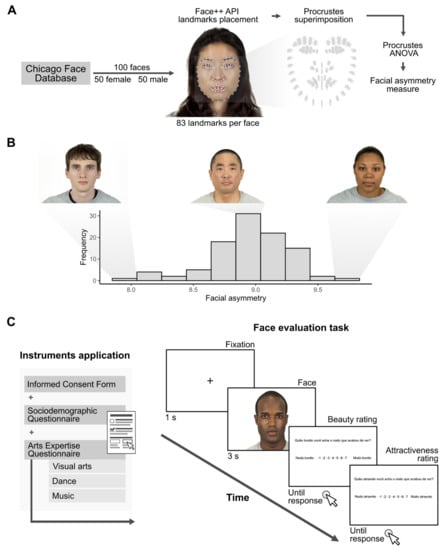 Measurement of facial asymmetry on selected faces (A), distribution of the facial asymmetry scores (B), and experimental procedure (C). In (A) 100 faces were randomly selected from the Chicago Face Database (CFD) [85]. Face++ API was used to automatically add 83 landmarks on each selected face. Data from landmarks underwent a Procrustes superimposition and a Procrustes ANOVA analysis, from which individual facial asymmetry values were extracted. In (B) the full distribution of the facial asymmetry scores is shown. The photos above the histogram are, from left to right, examples of faces with minimum, median and maximum asymmetry scores. In (C) participants responded to the Informed Consent Form, a Sociodemographic Questionnaire, and Arts Expertise Questionnaire. Subsequently, participants performed the face evaluation task. On the first screen, a fixation cross is shown, followed by a face drawn from the CFD, and on the third and fourth screens, respectively, the questions: ‘How beautiful do you think is the face you just saw?’ and ‘How attractive do you think is the face you just saw?’ answered on a 1–7 numerical rating scale.