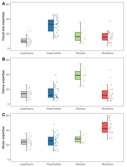 Although we used art expertise as a continuous variable, we artificially divided the sample into groups of laypersons (n = 48), visual artists (n = 27), dancers (n = 19), and musicians (n = 22) to check if the Arts Expertise Questionnaire was effective in quantifying expertise. Thus, it is expected that the group of experienced artists (students and professionals in the field) obtain higher scores in their respective artistic areas than participants from other groups.