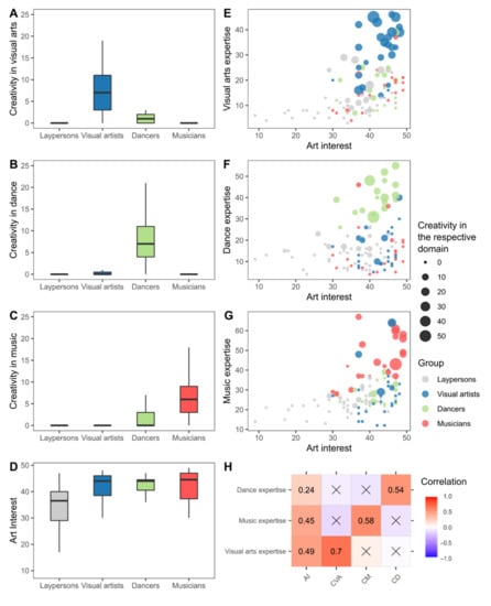 The expertise scores of the participants in the three artistic modalities correlated significantly with creativity in their respective domains (visual arts: r = 0.7, p < 0.001; music: r = 0.58, p < 0.001; and dance: r = 0.54, p < 0.001). In addition, art interest correlated significantly with the expertise scores of the participants in all the artistic areas (visual arts: r = 49, p < 0.001; music: r = 0.45, p < 0.001; and dance: r = 0.24, p = 0.009). The relationship between these variables is shown in Figure 3E–H. It is also possible to visualize that visual artists (Figure 3E), musicians (Figure 3F), and dancers (Figure 3G) had higher scores in expertise, art interest, and creativity in their respective domains.