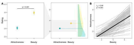 Relationship between beauty and attractiveness ratings. In (A), first panel shows mean ± SE of beauty and attractiveness ratings (partial effects). The second panel shows the mean attractiveness and beauty ratings (colored dots) and the overlapping kernel density estimate of the full distributions of these ratings. Dashed lines indicate the position of means on their respective distributions. In (B) Correlation between beauty and attractiveness (black line) is shown. Gray lines were adjusted separately for each participant using multilevel modeling. In the upper left corner are the correlation coefficient for repeated measures (rrm) and the respective p value.