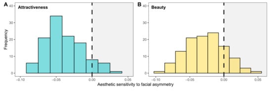 We used linear mixed-effects models (LMMs) to test whether beauty and attractiveness scores were affected by the facial asymmetry of the observed face. We included random intercepts and slopes within participants and intercepts within stimuli as random effects. Following Clemente et al. [82], we extracted individual slope estimates from the random-effects structure of LMMs as a measure of aesthetic sensitivity—the extent to which a particular sensory feature affects someone’s aesthetic valuation [92]—to facial asymmetry for each participant. In this case, negative slope values indicate lower preference for facial asymmetry, which is expected for most participants, whereas positive values indicate greater preference for facial asymmetry. Shapiro–Wilk test was used to assess the distributions’ normality of individual slopes. Skewness and kurtosis are shown when the Shapiro–Wilk test p-value < 0.05.