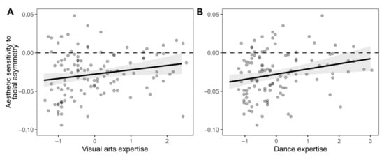 In general, we found that the degree to which facial asymmetry affects beauty evaluation (i.e., aesthetic sensitivity to facial asymmetry) was influenced by participant’s visual arts and dance expertise, but not music expertise. Previous research has found an effect of visual arts expertise in the aesthetic evaluation of symmetry/asymmetry in abstract figures [49,50,51]. The results of Weichselbaum et al. [50] and Gartus et al. [51] indicated that art experts, in general, tended to evaluate stimuli independently from their asymmetry when compared to laypersons. Our results demonstrate that the same trend found for abstract figures can be expected for human faces aesthetic evaluation, not only for visual arts experts but also for dance experts.