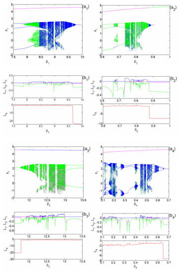 Bifurcation diagrams and the corresponding spectra of Lyapunov exponents plotted in the different ranges , , , and for different fixed parameters: , , , and ; , , , and ; , , , and ; , , , and respectively.
