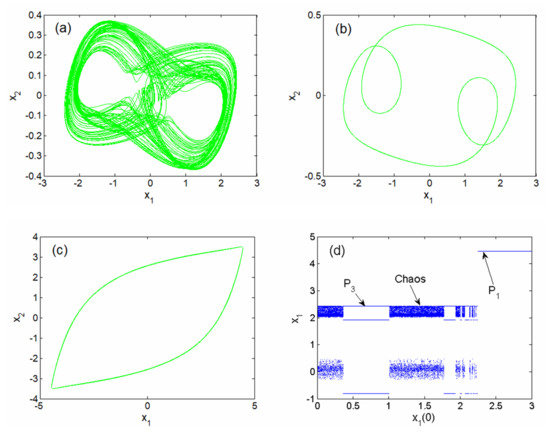 By carefully observing the previous bifurcation diagrams, a more or less wide window (by superimposing two datum obtained by increasing and decreasing the values of the control parameter) showing the coexistence of the attractors is highlighted according to the color difference. For the set parameters , , , , and , by changing only the original condition , a coexistence of three different attractors (a chaotic attractor that coexists with two other periodic) is observed and presented in Figure 3a–d.