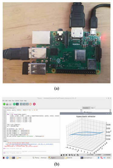 Raspberry Pi is a mini-computer that can be connected to a monitor and is used as a standard computer. It is important to note that there are multiple variations of this mini-computer. It needs a minimum number of elements to function and a micro SD memory card compatible with the chosen model, which is used as a hard disk; a keyboard to enter commands; and a monitor to view them. A 5V DC power supply is required to operate the card, not to mention power and connection cables. Raspberry Pi is used for multiple purposes as needed, particularly in computer programming and these related fields [35]. The hyperchaotic oscillator used in this work is solved by using the integration algorithm of Runge–Kutta under a Python programming environment. The phase portrait obtained is observed on the monitor of Figure 4 with a remarkable similarity to that previously observed in Figure 2b.