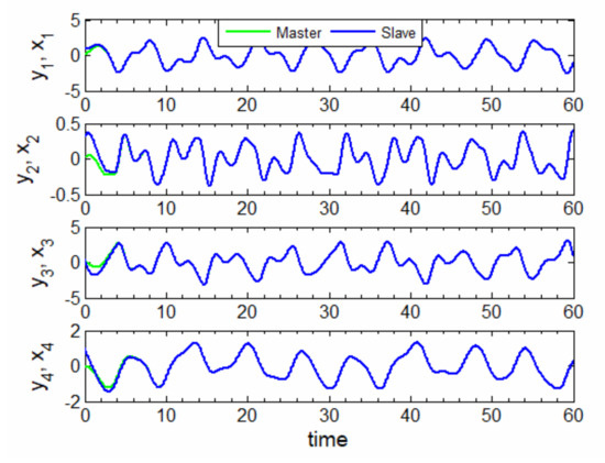 The introduced model is hyperchaotic for , , , , and . The slave system of the previous system is given by the following:
