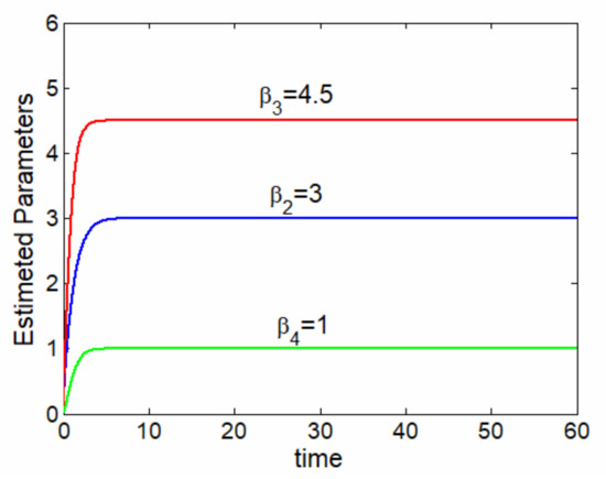 The complete synchronization of the different master and slave system states is described in Figure 5. Figure 6 displays that the determined values of parameters , , and converge to system parameters , , and .
