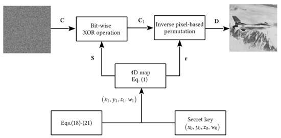 The decryption is usually a reverse of the encryption process. The decryption scheme corresponding to the proposed encryption approach is displayed in Figure 8. The presented algorithm is symmetric, which means that it utilizes the same cryptographic keys for both encryption of plaintext and decryption of ciphertext. Accordingly, the secret key of (1) (cf. ) along with the hash value of the pristine image should be communicated to the decryption part. By applying (18)–(21), the receiver produces the correct secret key and can then recover the original image by using (27):