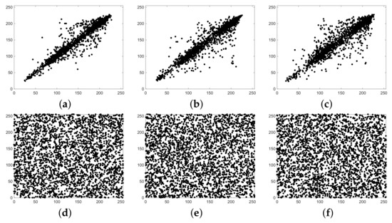 According to Kerkhoff’s law of the cryptology [43], assuming all the encryption/decryption algorithms are well known to the attackers, the confidence of the cryptosystem relies only on the secret keys. Cryptanalysts can rebuild the secret key or its equivalent form to decrypt a partial or total content effectively. They can even find a process to recover the pristine image from the cipher image without seeing the key by analyzing the correlations between the encrypted image and the pristine image or the secret key. These search methods resulted in two well-known attacks: the known-plaintext attack and chosen-plaintext attack. A robust cryptosystem should be capable of withstanding these attacks. In the suggested scheme, the SHA256 hash function is adopted to derive the primary values of the hyperchaotic system and its control parameters. Hence, they are sensitive to even a tiny bit of modification in the key and the plain image. This ensures completely different chaotic sequences for the distinctive plain images even if the same secret keys are used. Therefore, a cryptanalyst would not retrieve helpful information about the keys or the decrypted image by analyzing the proposed algorithm. This is because this information highly depends on the input plain image. Consequently, the proposed scheme can resist both the known-plaintext and the chosen-plaintext attacks.