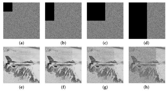 Result of occlusion attacks: ciphered images with (a) , (b) , (c) , and (d) data loss; corresponding decrypted images (e–h) as per (a–d).