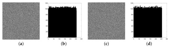 In the case of an attack, the cryptanalysts use all-black and all-white pixel images to make the cipher’s substitution and/or permutation processes invalid and infer valuable information. Figure 17 shows the encrypted images and their histograms related to the all-black and all-white images. It is observed that the encrypted images provide no helpful information as they are random-like images, and also, their histograms are quite uniform. The adjacent pixel correlation per direction is displayed in Figure 18 for the all-white and the all-black images, and they all are found to be very close to zero. The p-value in the chi-square test is sufficiently larger to pass the null hypotheses, and the global and the local entropies are very close to the ideal value of 8 for both all-black and the all-white images, as reported in Table 12. Moreover, Table 13 shows that UACI and NPCR values are very close to the typical values of 99.6% and 33.4%, respectively, in both cases. This ensures the ability of the proposed scheme to resist differential attacks effectively. Moreover, the proposed encryption scheme can successfully encipher full-black and full-white images resisting the known and chosen-plaintext attacks.