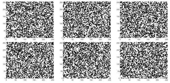 - Bit-wise diffusion: Apply the diffusion function to the elements of using as follows:where ⊕ indicates the bit-wise XOR process and is the encrypted image. Simply, the diffusion process can be formulated as follows.