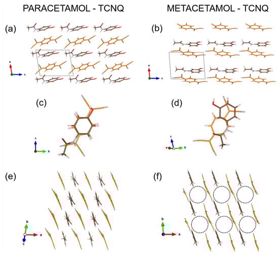 Paracetamol-TCNQ (a,c,e) and metacetamol-TCNQ (b,d,f) structures viewed along selected projections. Carbon atoms of paracetamol and metacetamol molecules are in brown, carbon atoms of TCNQ molecule are in orange, nitrogen atoms are always in light blue, oxygen atoms are in red, and hydrogen atoms are in light grey. The [001] channel in metacetamol-TCNQ is emphasized by a dashed circle (diameter about 6 Å).