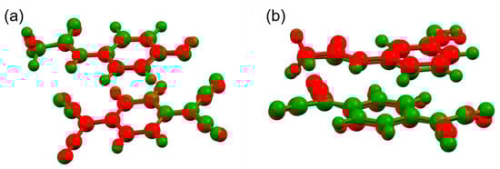 Computational optimization was performed on both structures using CRYSTAL17 software [], as previously done for olanzapine-phenol co-crystal []. A comparison of the experimental and calculated structures shows only minor differences in the hydrogen-bond lengths or relative ring angles, while the overall structure remains virtually intact. This confirms that the models determined experimentally based on 3D ED data are indeed structural energy minima (Figure 5).
