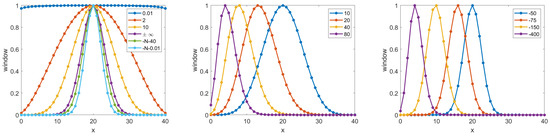 with or and with the Pochhammer function denoting the rising factorial [8]. The shape of weight function is defined by these two parameters that allow to steer the location and width of the peak. Examples of the influence of the parameters on the weight function are shown in Figure 1. If , the maximum of the weight function occurs for ; if the window is symmetric. Particularly, the freedom in the window’s effective width at each N is an asset provided by the Hahn polynomials compared to the discrete Chebyshev and Krawtchouk cases.