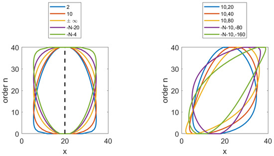 These features of the Hahn functions can be displayed in the plane, as shown in Figure 2, where for each function order n the central lobe is visualized by the boundaries . This gives a contour in the plane within which the energy of the functions are concentrated. We observe that depending on whether or <N, the spread is higher or lower for higher orders.