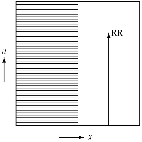 Algorithmic strategy for the calculation of the discrete Chebyshev functions. The process is initiated by calculation of the zeroth-degree function. The termination of executing the recurrence relation depends on the attained norm (in the n direction) and differs per x. The striped area indicates the part that need not be calculated but can be obtained from symmetry.