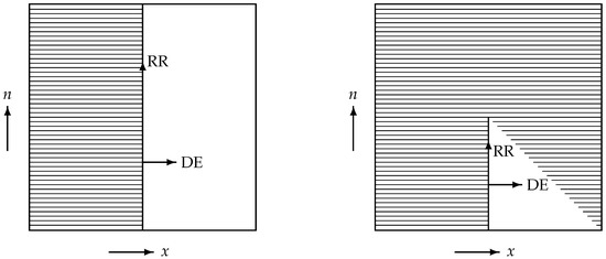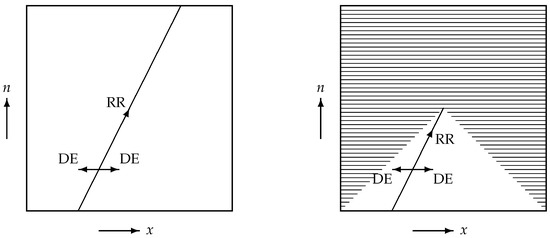 Algorithmic strategy for the calculation of the functions in case of symmetric weight functions. (Left): discrete Hahn and discrete Chebyshev functions; (right): Krawtchouk functions. The striped area indicates the part that need not be calculated but can be obtained from symmetry. The recurrence relation runs over the central values of x, and the difference equation is used for the other values, starting from the center of the interval. Termination of the execution of the difference equation depends on the attained norm and is evaluated at each n independently.