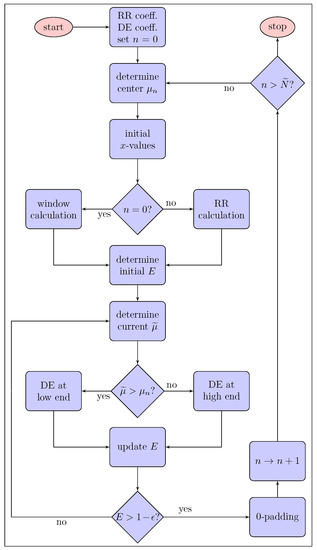 Given these input parameters, the algorithm determines and stores the coefficients of the recurrence relation and difference equation. Once this is done, a loop over the order n is executed, starting with and running until . Within this loop, first the center of energy is considered; in fact it has already been calculated as it equals one of the recurrence relation parameters, see (19). This value is translated into two integer values of x closest to it: and . If , the recurrence relation is used to generate at these values from the lower-order samples. If , they are generated by the initialization procedure discussed in Section 4.5. From these initial values, the associated norm is determined, thereby starting the norm tracking. Additionally, the actual center of energy, i.e., that associated with the samples generated so far, is determined. Depending on whether the actual center is lower or higher than the real center , the range of x-values at this particular n is extended in the upper of lower boundary of the existing range by the difference equation (DE). After having generated this new sample , the norm is updated and compared with the stop criterion. If it is lower, we proceed to generate a new sample at this order by returning to the block deciding whether to extend at the lower or higher range. If the criterion is met, all samples outside the already generated range of x are set to 0 (zero-padding). The order is increased by one, and if less than the maximum order, the process starts with the steps to calculate the samples at this updated order n.