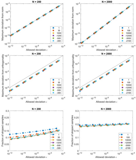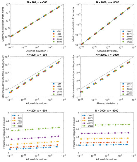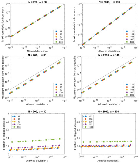 In Figure 9 and Figure 10, the results of the validation are shown for asymmetric weight functions. Again, for those orders where truncation occurs, the maximum deviation from norm is always smaller than the specified deviation. The orthogonality is below . The amount of zero-padding is only slightly affected by the specified accuracy. The amount of skewness, however, has a large influence: with at 5 % of the full interval, more than half of the data are set to 0 in case of negative values of .