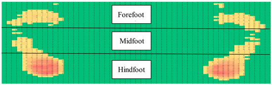 The plantar pressure data were obtained at 100 Hz with a FootScan® RsScan International® Balance pressure plate (Olen, Belgium). For image analysis and to obtain the maximum plantar pressure values (in N), we divided the foot into three regions—hindfoot, midfoot, and forefoot (Figure 1)—according to previously established functional criteria and according to the length and width of the plantar surface of each individual [23].