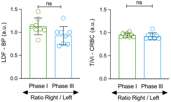 Perfusion ratios (right/left feet) as an indicator of the individual asymmetry measured with LDF and PSp (TiVi) instruments at Phase I and Phase III (see text). Comparisons between phases are also shown (ns—non-significant).