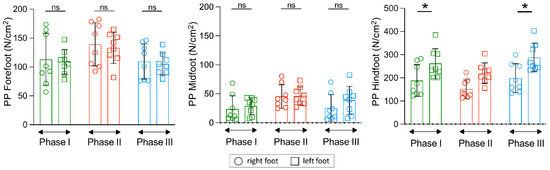 Plantar pressure (PP) asymmetries measured in three areas of both feet during the different phases of the experimental protocol. Comparison between feet in each foot area depicts a significance difference in plantar pressure asymmetry at the hindfoot in all the phases of the protocol (* p < 0.05; ns—non-significant). Note the differing Y-axis values in the far right panel (hindfoot).