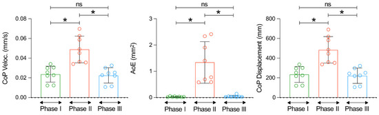 Posture related changes expressed as Velocity of the Centre of Pressure (Veloc. CoP) Maximum Area of the Ellipse (AoE) and CoP Displacement registered during the experimental protocol (* p < 0.05; ns—non-significant).