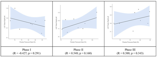 Under this view, we decided to explore potential relations between stance, blood perfusion, and plantar pressure to better understand these lower limb asymmetries and their implications. Although not equally distributed along the foot, plantar pressure differences were present in all individuals at Phase I (Figure 3). Higher plantar pressure was registered in the hindfoot and here the left foot showed statistically significant higher values when compared with the right foot, such as perfusion measured by LDF. The squat in Phase II reduced plantar pressure displaced to the other regions but accentuated these statistically significant differences in Phases II and III (Figure 3). Forefoot and midfoot pressures were lower, and their differences were not statistically significant in any of the phases, but the squat of Phase II increased the plantar pressure in these regions (Figure 3).