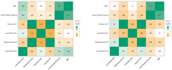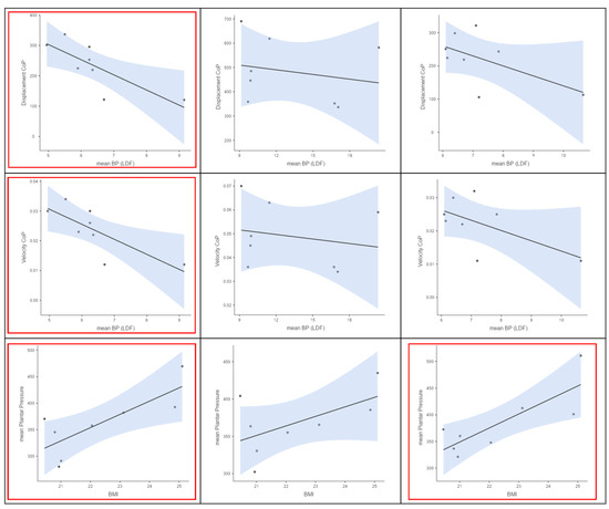 Further analysis of correlations among variables suggests important relationships in Phases I and III, while it is not possible to identify statistically significant correlations in Phase II. As seen in Figure 6 and Figure 7, mean perfusion measured by LDF in Phase I is inversely correlated with the centre of pressure (CoP) velocity (p = 0.025) and CoP displacement (p = 0.024), while the body mass index (BMI) and mean plantar pressure are positively correlated (p = 0.022). In Phase III, no significant correlations are observed between plantar pressure variables and stance and perfusion. However, the correlation of BMI with mean pressure remains significant (p = 0.014).