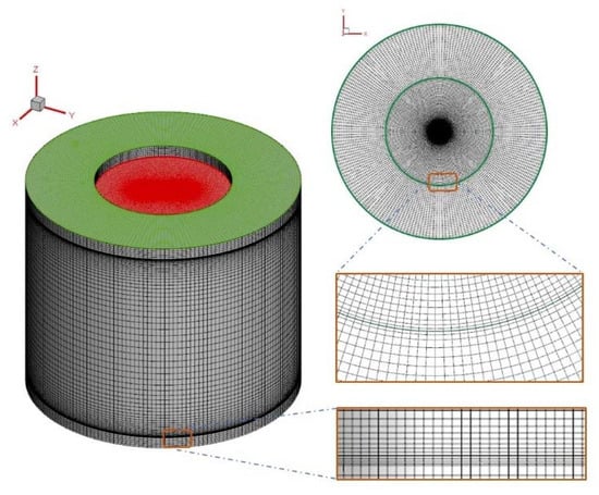 The finite volume method is used to discretize the governing equations. The second order central difference scheme and QUICK scheme are used for the diffusion term and the convection term, respectively. The PISO algorithm is used for pressure velocity correction, and a second order implicit scheme is used for the unsteady state term. The time step is 1.0 × 10−4 s. Figure 2 shows the calculation grid of the liquid bridge when the AR = 3. Due to the large velocity and temperature gradients near the disks and free surface, the grid is densified in these areas, and the uniform grid is used in the circumferential direction. In order to verify the correlation of grids, when the Ma = 73,846, three kinds of grids are used for calculation, and the results of free surface temperature and velocity are shown in Table 2. When the number of grids is 360,000 and 420,000, the relative errors of velocity and temperature are less than 1%. Therefore, considering the calculation time cost and accuracy, the number of grids is 360,000.
