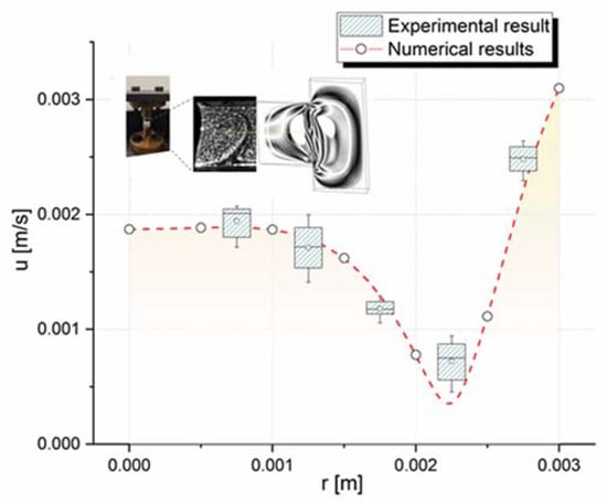 A ground experimental verification was performed to verify the present model and code, as shown in Figure 3. The upper and bottom disks of the liquid bridge were made of brass with good thermal conductivity. The experimental system was equipped with a side-view CCD camera, which was used to observe the overall flow pattern in the liquid bridge. Refer to our previous research for a detailed configuration of the experimental equipment []. The temperature difference between the upper and lower rods was 10 K. The numerical velocities in the center line of the liquid bridge and the multiple experimental velocities from the sampling points agreed relatively well with each other. Particle image velocimetry (PIV) was used to measure velocities of particles in the liquid bridge. In the process of velocity measurement, all measuring devices did not interfere with the flow field and had high measurement accuracy.