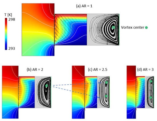 Ma represents the intensity of thermocapillary convection. When the Ma number is lower than Mac (Yano et al. []), the flow field in the liquid bridge is axisymmetric. In this state, the flow field structure is greatly affected by AR. The streamline and temperature distribution on the x–z plane of a liquid bridge with different AR are shown in Figure 4. Where H = 30 mm, Pr = 67, Tc = 293 K and TH = Tc + ΔT, it can be seen that the flow field presents a single vortex structure when AR = 1 and 2 and a double vortex structure when AR = 2.5 and 3. In the space experiment of Yano et al. [], similar vortex structures were reported, as well. When Pr = 67 and AR = 2.5 and 3, this is a double vortex, and when AR = 1, 1.5 and 2, it is a single vortex.