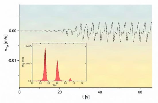 With the increase in the Ma number, the intensity of thermocapillary convection increases. When the Ma number exceeds the critical value (Mac), any small disturbance will be amplified and eventually form a three-dimensional oscillatory flow. Figure 6 shows the growth and amplification process of tangential velocity at the free surface monitoring point P (z = 0) for Ma = 11,211, Pr = 67 and AR = 2. At this time, the oscillation in the small disturbance of tangential velocity is gradually amplified, and then oscillates with a certain period, with the dominant frequency of 0.315, finally forming a three-dimensional time-dependent oscillatory flow.