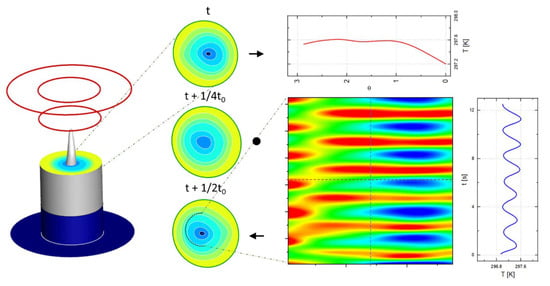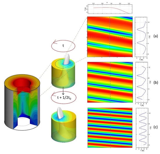 When AR = 3.5, the thermocapillary convection will change from traveling wave oscillation to standing wave oscillation. Figure 12 is the temperature STD diagram of the liquid bridge in the standing wave state on the z = 0 plane. The temperature STD image is in the shape of a wave, which indicates that the thermocapillary wave is a standing wave (Zhang et al. []). The thermocapillary wave number is also 1. Figure 12 also shows the temperature distribution in the liquid bridge at different times. In the z = 0 section, the standing wave makes the isotherm move left and right in a certain direction, while the traveling wave makes the isotherm rotate around the central axis.