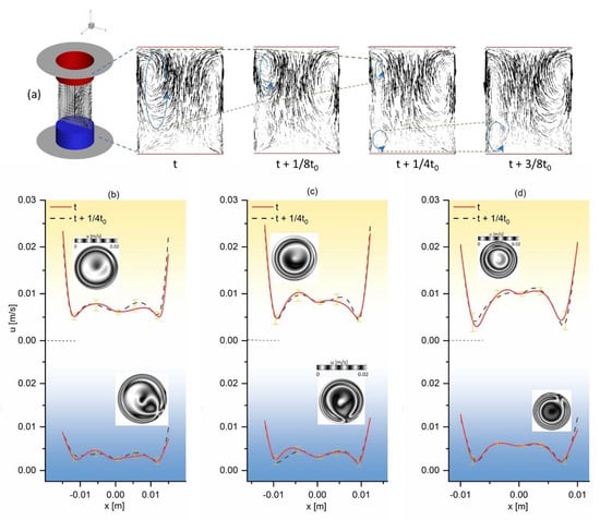 Figure 8a is the velocity vector of the x–z section of the liquid bridge with AR = 2 in quarter oscillation period. It can be seen from Figure 8a that the vortex of the AR = 2 liquid bridge in the x–z plane is always 2 in the oscillatory state. The vortices move back and forth between the upper and lower disks, and there is a half period phase difference between the left and right vortices. On the left side of the x–z plane, the vortex near the lower disk moves upward, while the vortex near the upper disk moves downward on the right side. Therefore, under the influence of oscillating thermocapillary convection, the vortices always disappear and appear periodically. In order to study the internal velocity oscillation intensity of the liquid bridge, the monitoring lines are taken at the positions of z = 10 mm and z = −10 mm, respectively. Due to the periodic flow of the flow field, the two sets of data extracted on the monitoring line are separated by a quarter of a cycle (t0). In Figure 8b–d, the upper part is the velocity of the monitoring line with z = 10 mm, and the lower part is that of z = −10 mm. It can be seen that in the upper half of the liquid bridge, the difference between the velocity on the free surface and the internal velocity is greater than that in the lower half. In the figure, the error line is represented as the oscillation amplitude, and it can be seen that the oscillation amplitude in the middle region of the liquid bridge of these types of ARs is small.