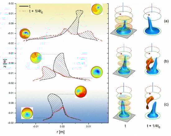 Figure 9 shows the isotherm (T = 296 K) in different AR liquid bridges at different times. The two selected moments are the highest position of the isotherm and the subsequent quarter cycle (t0). The temperature in the liquid bridge should be evenly distributed when there is no thermocapillary convection. Due to the long distance of reflux of the thermocapillary convection, it is difficult for the fluid to flow along the center of the liquid bridge in the process of oscillation, just like the steady-state flow, but it is inclined to the free surface. Due to the change in flow field structure, the temperature contour of the cross section at different heights of the liquid bridge is no longer concentric. It can be seen from the temperature contours at different times that the temperature distribution near the footwall is less affected by the oscillation, while the temperature distribution near the hanging wall is more affected by the oscillation. For different AR liquid bridges, the temperature iso-surface at 296 k presents an inclined cone. Since the oscillation state of thermocapillary convection in AR is a traveling wave, the conical iso-surface revolves around the central axis of the liquid bridge. This results in a large temperature change at different times of the same section in the middle of liquid bridge, as shown in Figure 9.
