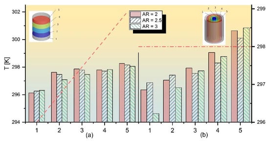 Average temperature for LB with different AR at (a) axial direction and (b) radial direction.